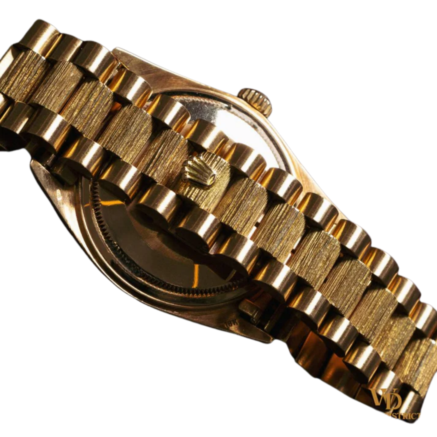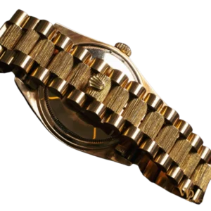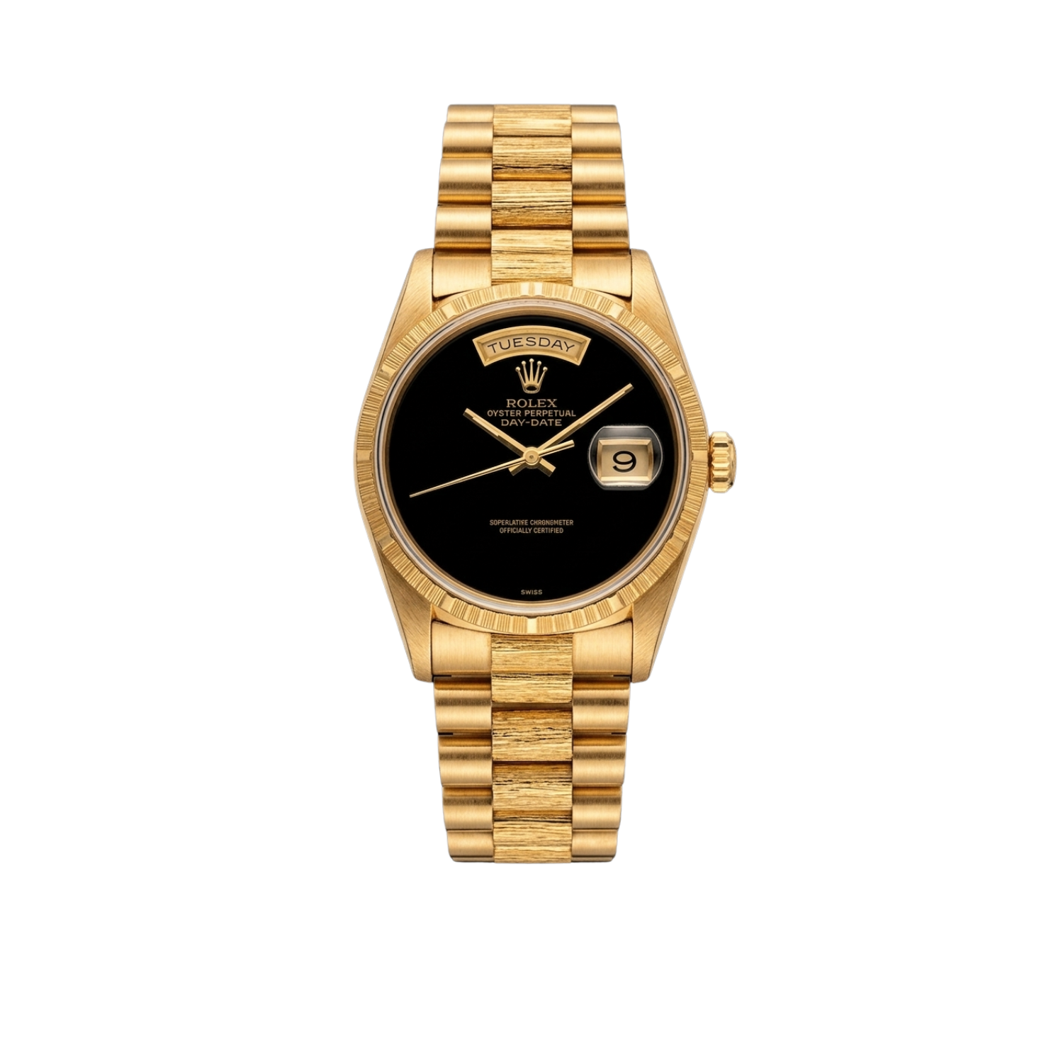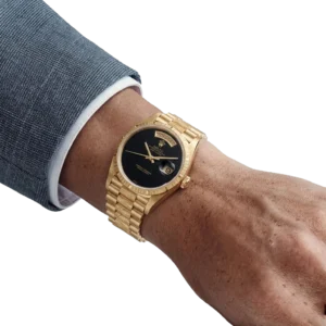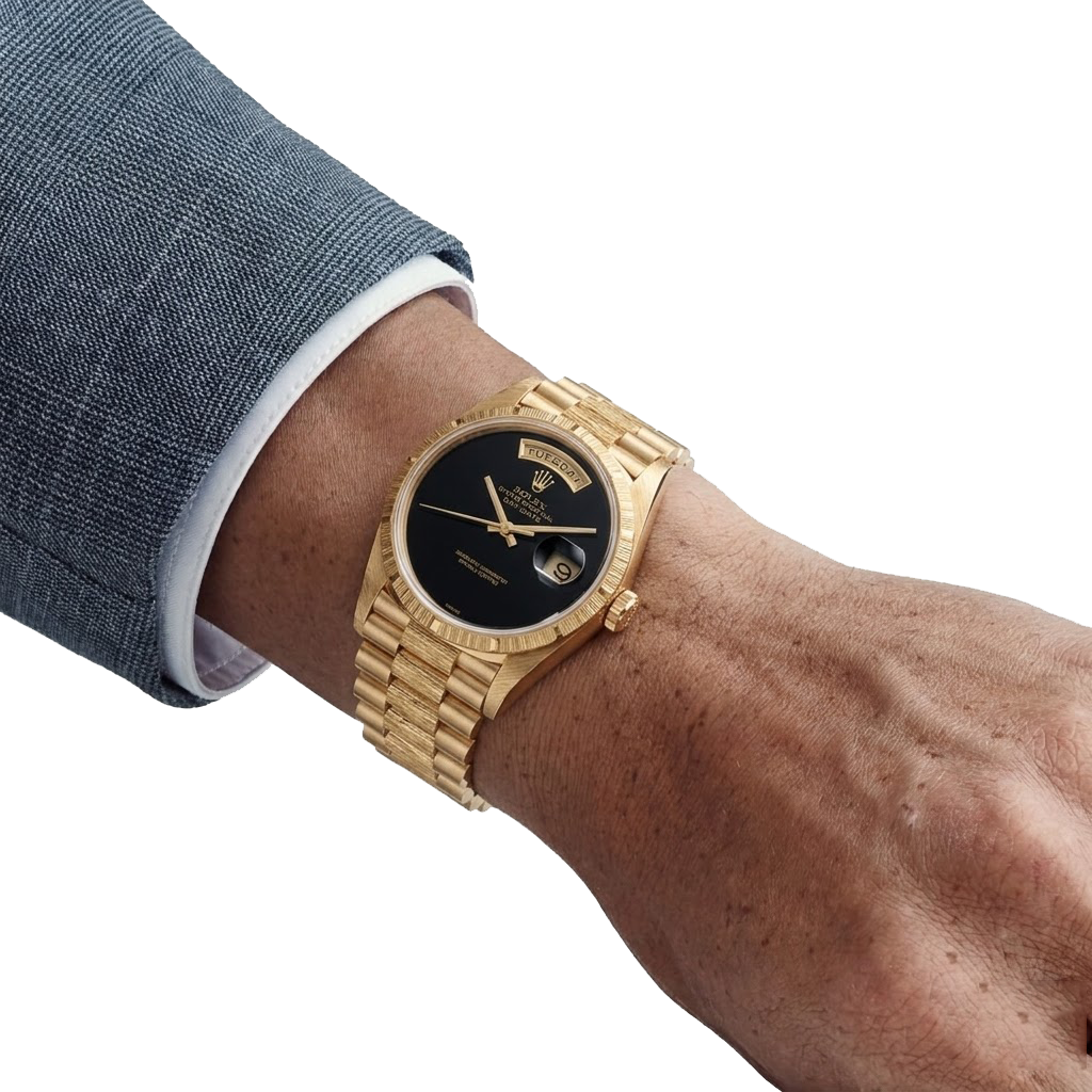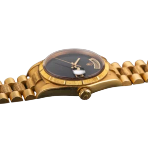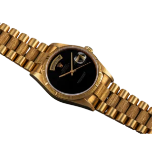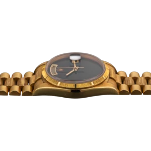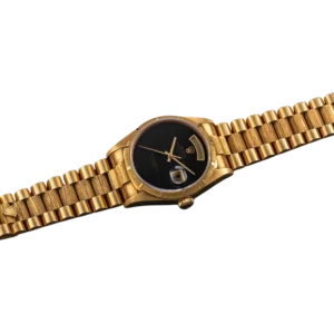 The Rolex Day-Date 36mm ref. 18248 is a symbol of power and prestige, crafted with the iconic President bracelet that exudes luxury. The natural black Onyx dial offers a minimalist yet extremely rare aesthetic, creating a deep, mysterious look that stands apart from standard dials. Its classic 36mm case is paired with the automatic Caliber 3155 movement, featuring the signature day and date display of the Day-Date line. This model is further enhanced by the double quickset function, allowing for convenient and precise adjustment of both the day and date.