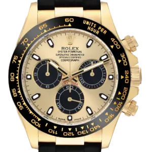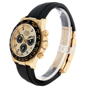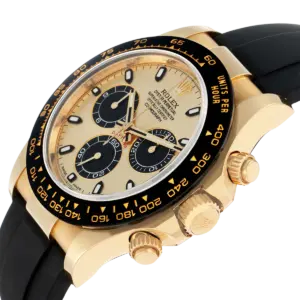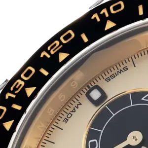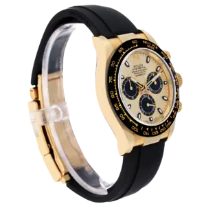 The warm champagne dial enhances the watch’s premium character, complemented by luminous-style baton hour markers and hands that maintain a clean, readable layout. Three contrasting black chronograph-style subdials preserve the signature Daytona design language, while the black bezel with engraved markings reinforces its sporty, motorsport-inspired identity.